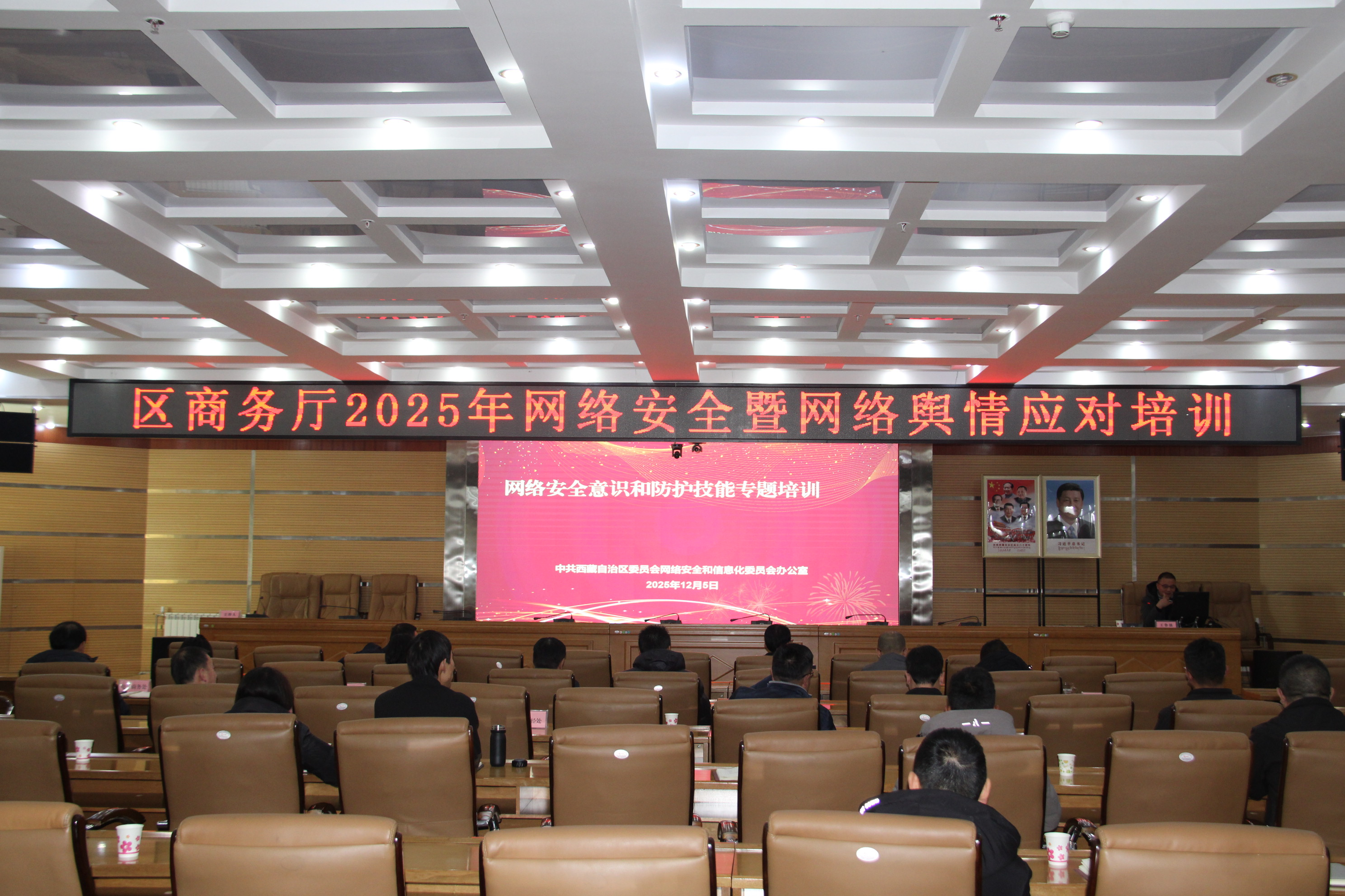 为进一步提升干部职工网络安全素养和舆情风险应对能力,筑牢安全防线。12月5日下午,商务厅举办了网络安全和舆情应对专题培训,邀请区党委网信办网络舆情管理处副处长高二伟、网络安全保障中心高级工程师王鲁镇到我厅进行现场授课。厅党组成员、供销社主任张军主持并讲话,在家厅领导、干部职工参加培训会。