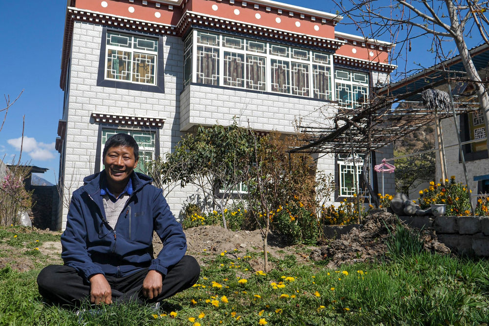 这是村民格桑旺久在自家新房前(2021年4月6日摄)。新华社记者 洛卓嘉措 摄