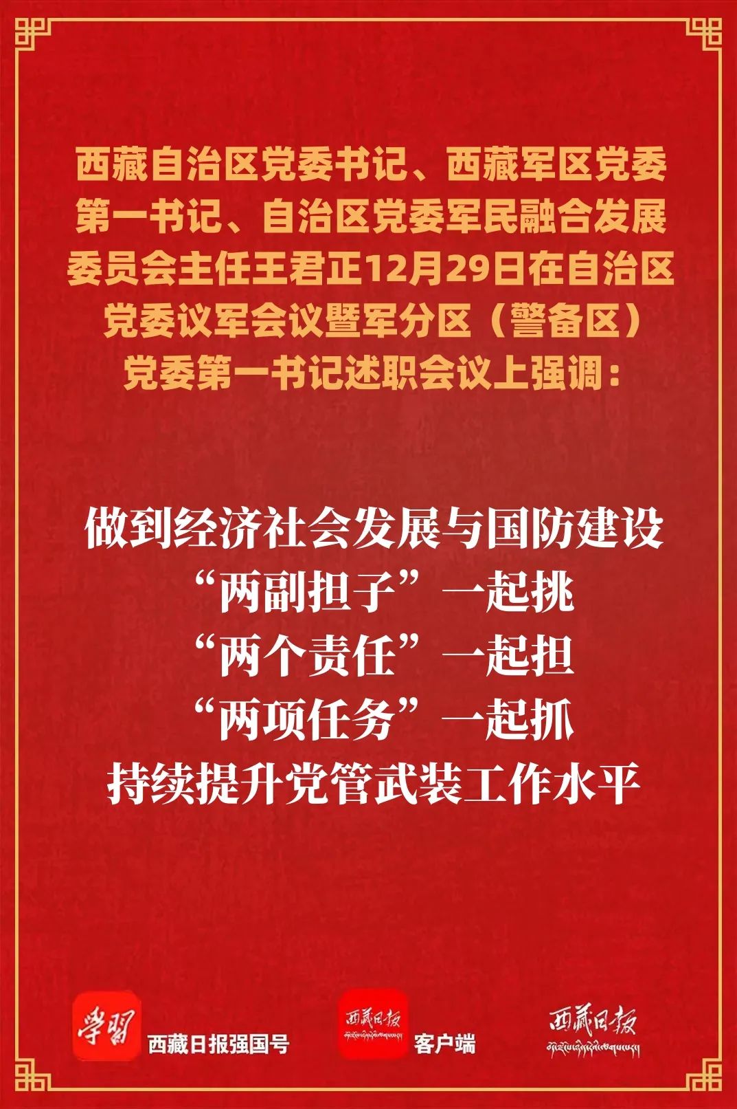 12月29日上午,自治区党委书记、西藏军区党委第一书记、自治区党委军民融合发展委员会主任王君正主持召开自治区党委议军会议暨军分区(警备区)党委第一书记述职会议,传达学习习近平总书记关于国防和军队建设的重要指示精神,听取各地市军分区(警备区)党委第一书记述职,安排部署2023年自治区固边稳藏、国防动员和双拥工作。强调,要深入学习贯彻党的二十大精神和习近平强军思想,坚决扛起党管武装政治责任,牢牢把握党管武装正确方向,深入推动军民融合发展,不断开创西藏长治久安和高质量发展新局面。