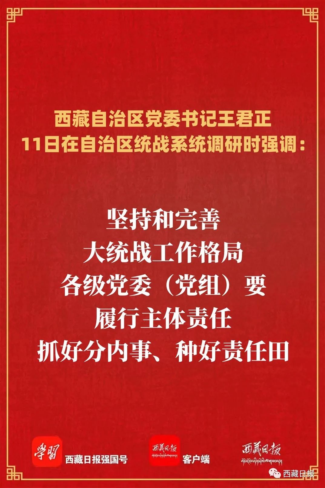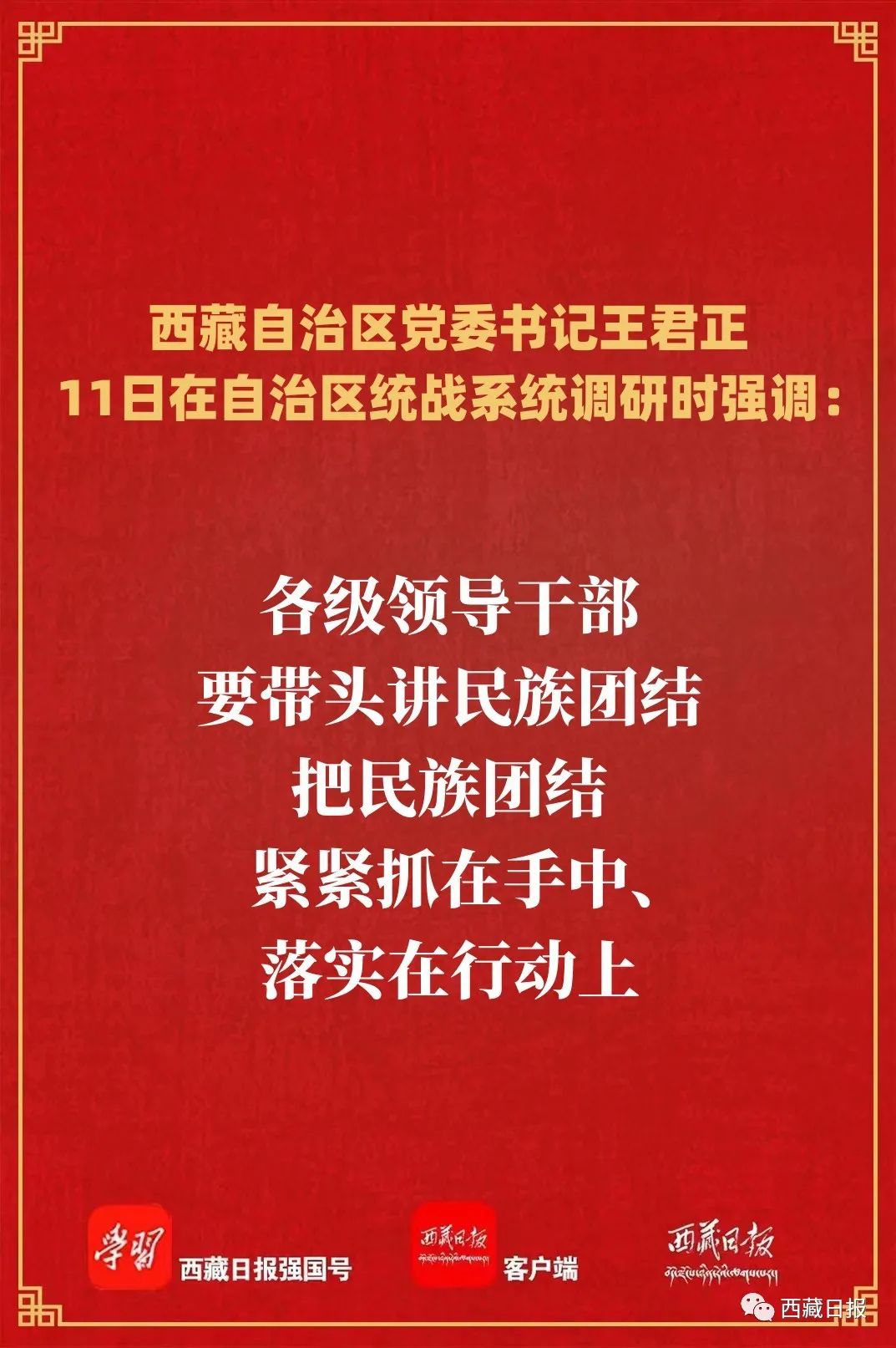 5月11日上午,自治区党委书记王君正在自治区统战系统调研。强调,要坚决贯彻落实习近平总书记关于做好新时代党的统一战线工作的重要思想、西藏工作的重要指示和新时代党的治藏方略,聚焦“四件大事”聚力“四个创建”,总结经验、把握形势、明确任务,调动一切积极因素,扎实做好新时代统一战线工作,为全面建设社会主义现代化新西藏而努力奋斗。