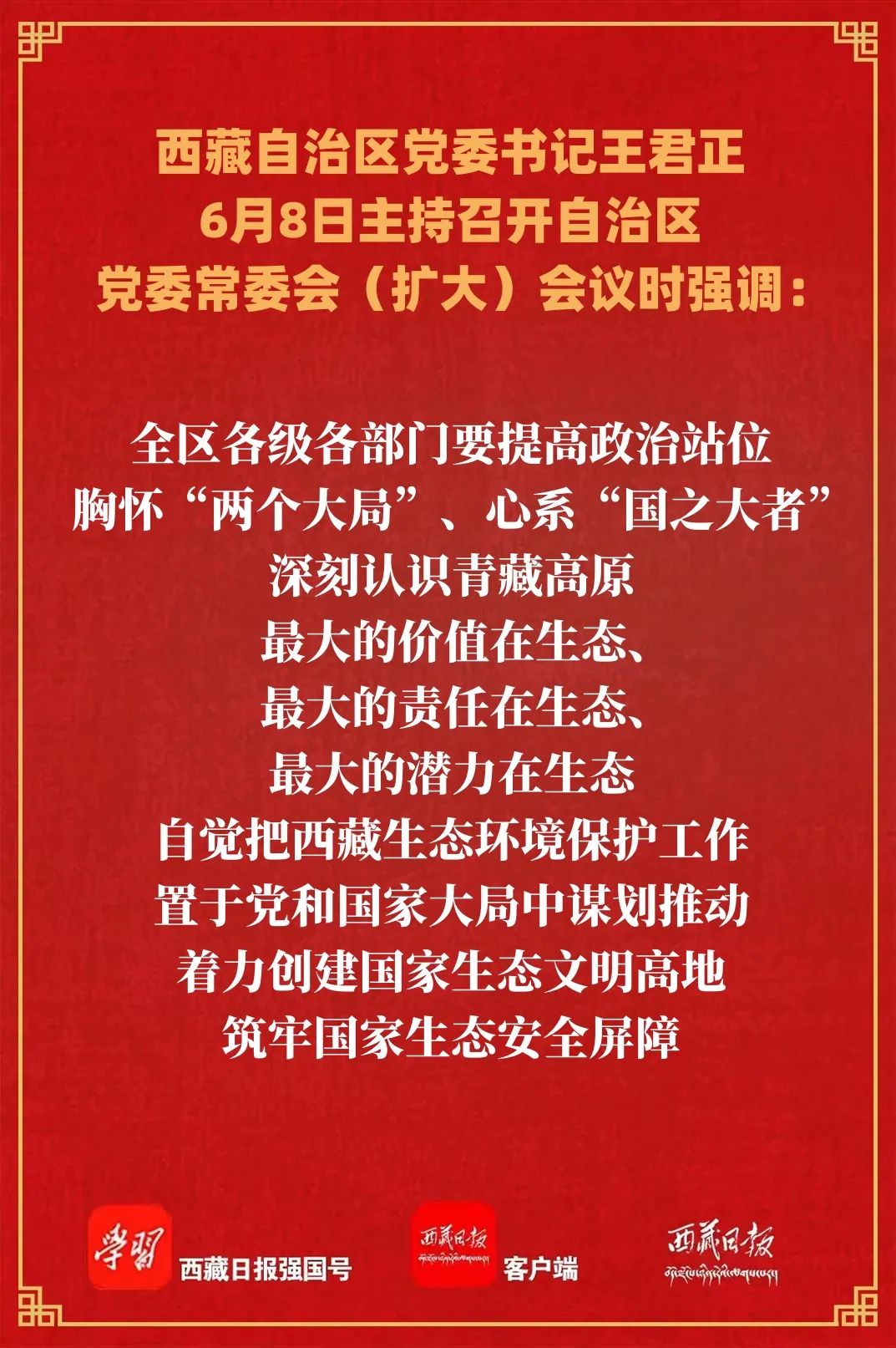 6月8日,自治区党委书记王君正主持召开自治区党委常委会(扩大)会议,认真传达学习习近平总书记在内蒙古巴彦淖尔考察时的重要讲话精神。强调,要深入贯彻落实习近平生态文明思想,牢固树立“两山”理念,把生态文明建设摆在更加突出的位置,坚决守护好雪域高原的生灵草木、万水千山。