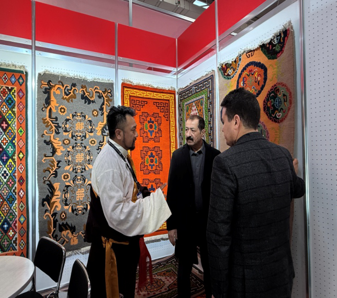 汉诺威国际地面铺装展览会是全球地面铺装领域规模最大、专业性最强、影响力最广的权威盛会。本届展会以“环保、可持续与性能升级”为主题,展品范围拓展至全品类室内装饰材料,展览面积达10.6万平方米,吸引全球1600家企业参展,4.5万名专业观众到场,是对接欧洲高端市场的重要窗口,中国参展企业近240家,展出面积约5000㎡。区商务厅立足高原羊毛天然原材料、国家级非遗编织工艺和天然矿物颜料染色特色,通过实物展示、工艺演示、文化讲解相结合的方式,集中展示传统手工藏毯、现代设计改良藏毯及文创衍生产品,全方位宣传藏毯的文化、工艺与环保价值。