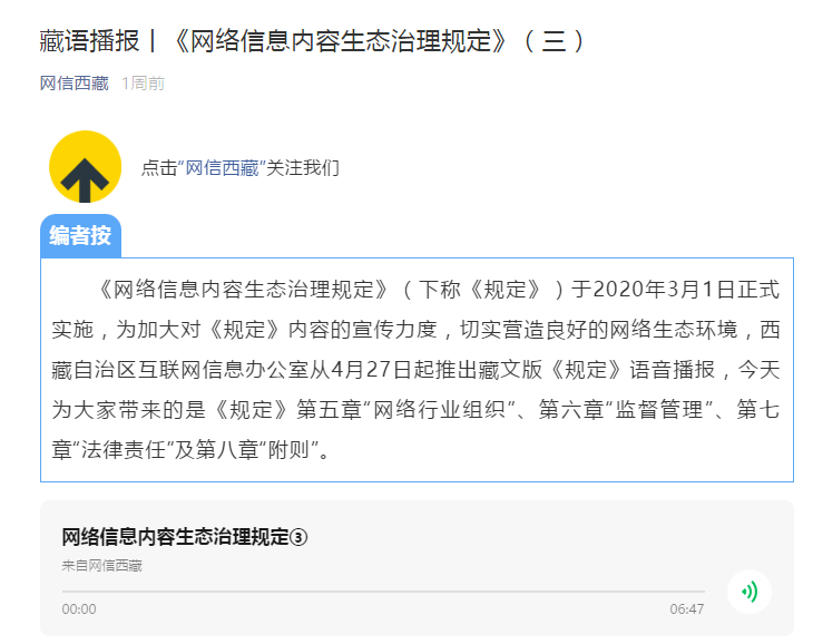 加大对《规定》内容的宣传力度,从4月27日起,在“网信西藏”微信公众号推出藏文版《规定》语音播报,并附藏文版《规定》全文,为藏区网民提供更便捷更丰富的学习方式之余,更以鲜活的表现形式提升藏区网民对网络生态治理的认知。截至目前,“藏语播报”栏目已更新三期,既可视又动听的传播手段深受当地网民欢迎。