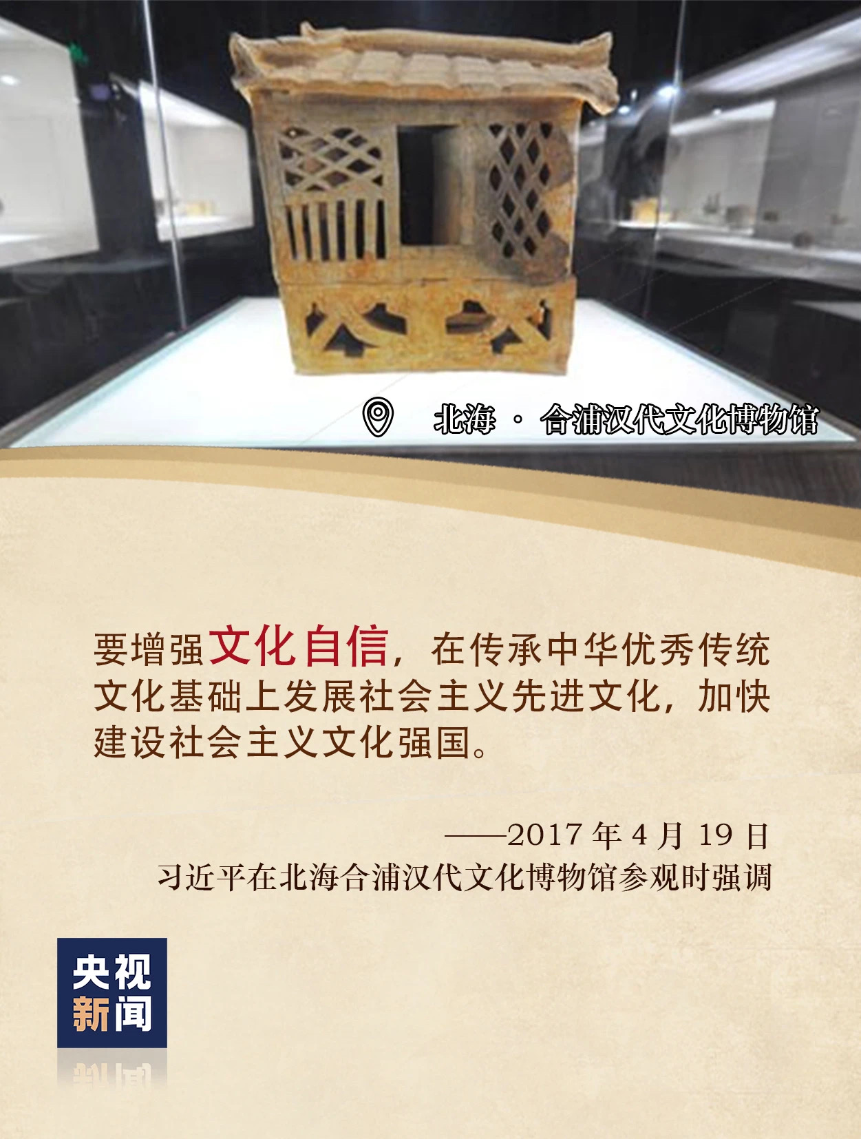 2017年4月19日,习近平到广西北海考察时,首站便是合浦县汉代文化博物馆。习近平说:“要加强文物保护和利用,加强历史研究和传承,使中华优秀传统文化不断发扬光大。”