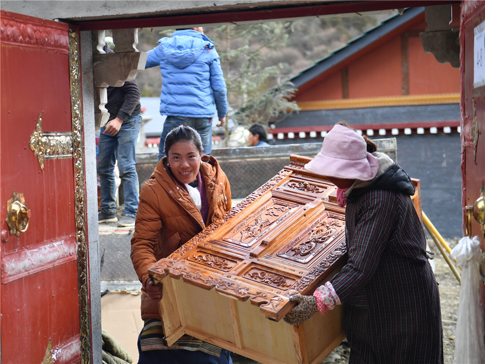 新搬入隆子县玉麦乡的居民在往新家搬藏式柜子(2019年4月8日摄)。新华社记者 晋美多吉 摄