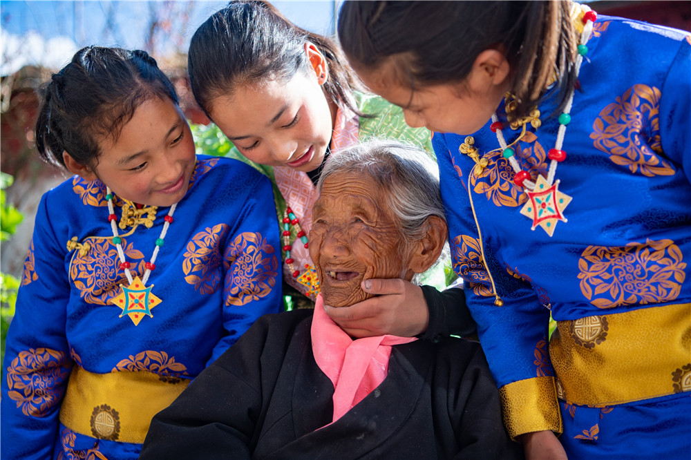 109岁的索朗卓玛和曾孙女旦增宗吉(右一)、旦增央吉(左一)、丹增曲吉在自家的院子里(3月24日摄)。新华社记者 普布扎西 摄