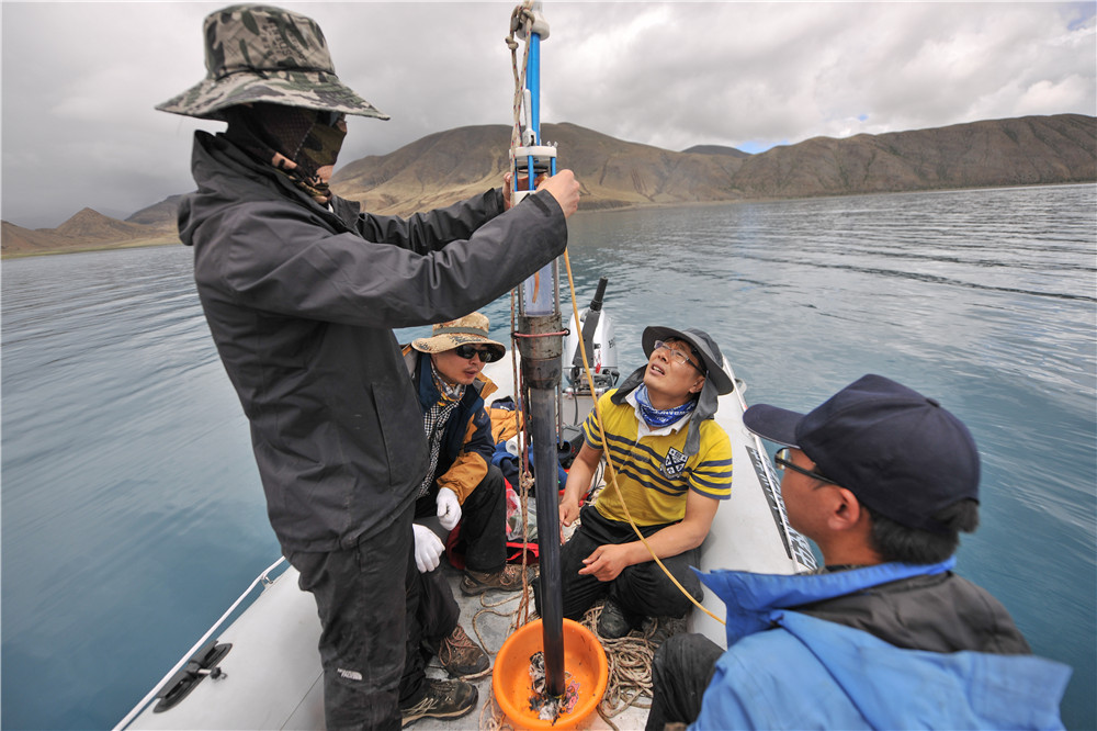 第二次青藏高原综合科考的科考队员在对羊卓雍错进行深度测量,并标记沉积物岩芯(2019年7月22日摄)。新华社记者 晋美多吉 摄