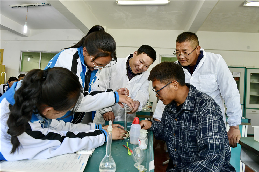 在西藏山南市第一高级中学,来自湖北省襄阳的援藏老师蔡春亭(中)和本地老师次仁曲旦(右后)指导学生做化学实验(2019年5月7日摄)。新华社记者 张汝锋 摄