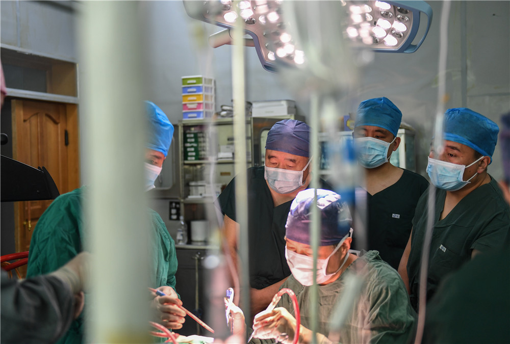 中国科学院院士、国家神经系统疾病临床医学研究中心主任赵继宗(左二)来到西藏自治区第二人民医院,为患者做脑动脉肿瘤手术,并对西藏当地医院医生进行现场指导(2019年9月17日摄)。新华社记者 晋美多吉 摄