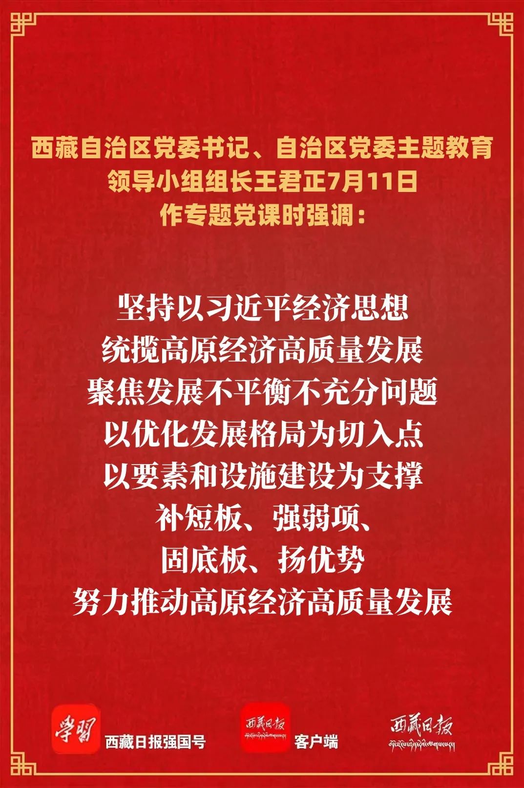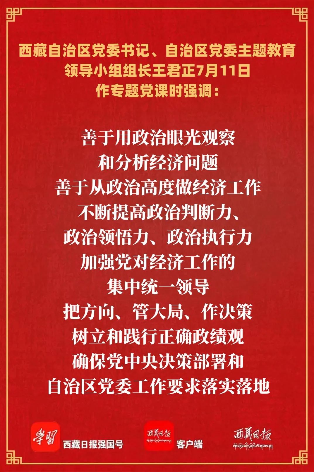7月11日上午,自治区党委书记、自治区党委主题教育领导小组组长王君正以“深入学习贯彻习近平经济思想 不断提高新时代干部领导经济工作的能力”为主题作专题党课。强调,各级党员领导干部要学习贯彻落实习近平经济思想,弘扬理论联系实际的学风,不断提高干部领导经济工作的能力和水平,奋发有为推进经济高质量发展,为全面建设社会主义现代化新西藏作出新的更大贡献。