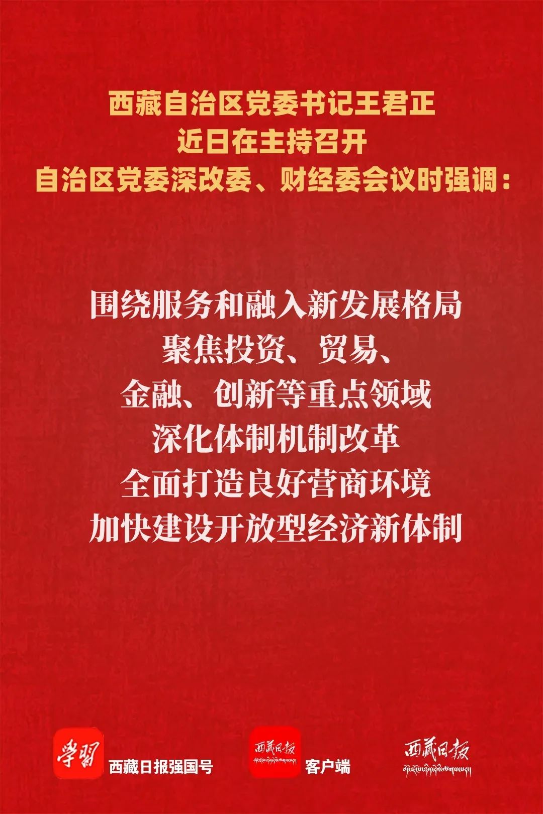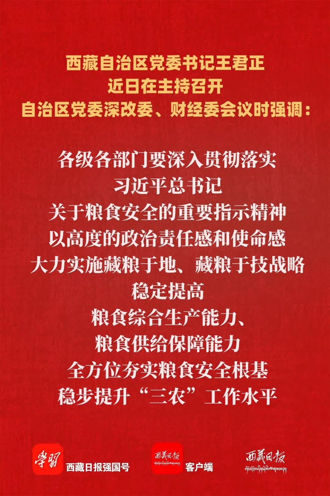 近日,自治区党委书记王君正主持召开自治区党委全面深化改革委员会、财经委员会会议,传达学习习近平总书记在中央全面深化改革委员会第二次会议、中央财经委员会第二次会议上的重要讲话精神。强调,要深入贯彻落实习近平总书记重要讲话精神,持续推进全面深化改革,努力提升“三农”工作水平,为西藏长治久安和高质量发展贡献力量。
