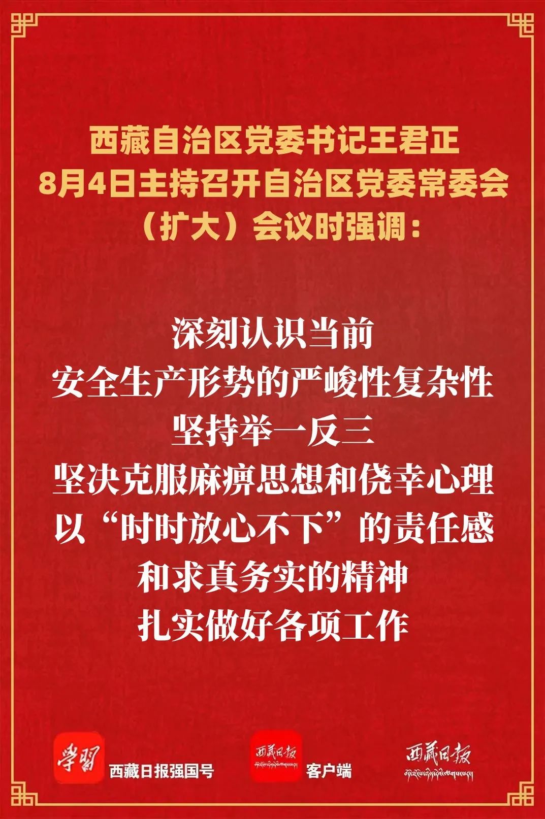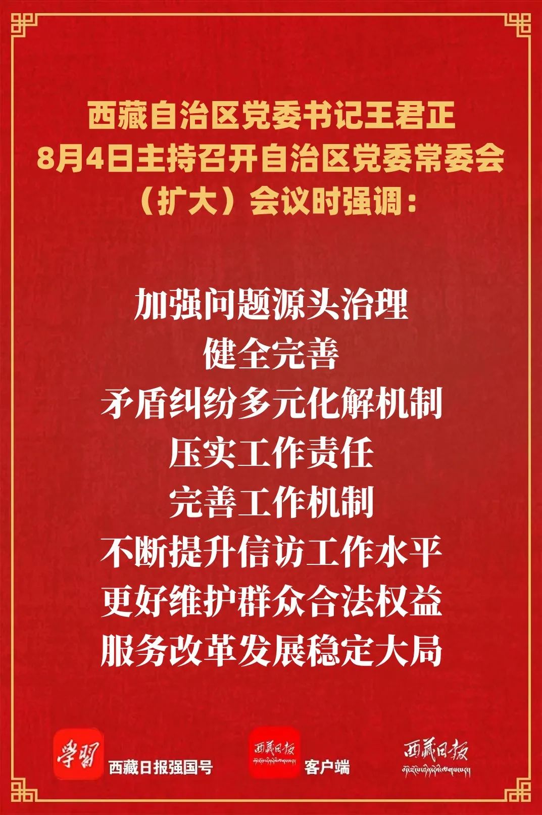 会议传达学习了习近平总书记在四川、陕西汉中考察时的重要讲话精神。王君正强调,全区各级各部门要提高政治站位,深入学习领会习近平总书记重要讲话精神,准确把握工作要求,聚焦“四件大事”聚力“四个创建”,努力建设社会主义现代化新西藏。加快推进高原经济高质量发展,努力在提高科技创新能力、建设现代产业体系、全面推进乡村振兴等方面实现新突破。处理好高质量发展和高水平生态保护的关系,坚持山水林田湖草沙冰一体化保护和系统治理,科学开展国土绿化行动,以高品质生态环境支撑高质量发展。全面提升文物保护利用和文化遗产保护传承水平,充分挖掘和利用好文化资源优势,加大文物保护修复力度,推动优秀传统文化创造性转化、创新性发展。